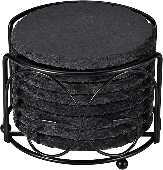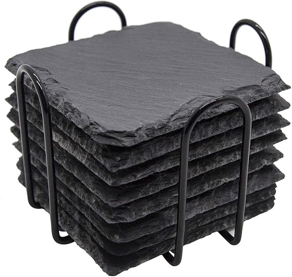 4" natural slate coasters, available in both round and square. Coaster feature soft feet to protect surfaces and are laser engraved with your choice of design. Order individually or as a convenient 8-pack, which includes a sleek metal holder for easy storage and display.